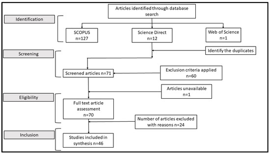 The literature survey is conducted in a structured approach which covers identification, screening, eligibility assessment, and final inclusion. The PRISMA Statement, which outlines the Preferred Reporting Items for Systematic reviews and Meta-Analyses, was the principal criterion used in this study. PRISMA can be defined as guidelines that provide a structured framework for authors to follow when writing and reporting systematic reviews and meta-analyses [33]. Its use by Cochrane Collaboration defines the systematic review as “an examination of a clearly formulated questions that uses systematics and explicit methods to identify, select, and critically appraise relevant research and to collect and analyse data from the studies that are included in the review. Statistical methods may or may not be used to analyse and summarise the results of the included studies” [34,35]. The primary search criteria applied for identification of the articles in each database are as follows: “(“water quality” or “air quality” AND ‘low-cost sensors’ AND “calibration”)” and with time-period 2013 to 2022. The number of articles identified from the databases SCOPUS, Science Direct, and Web of Science are 127, 12, and 1, respectively. The returned articles were uploaded to the Rayyan online platform [36] for screening and preselection of publications for further review of articles. We excluded papers that were not in English, unpublished, or duplicates, resulting in 70 papers being selected for further review. In the subsequent phase, eight of the authors independently evaluated the title, abstract, and conclusions of these 70 papers based on specific inclusion and exclusion criteria detailed in Table 1 to determine their relevance. This process identified 46 relevant papers and a thorough full-text review of the 46 shortlisted papers was conducted. To write this study, we looked at more than just the aforementioned papers and book chapters to determine the types of sensors for each relevant parameter since there are numerous sensors made explicitly for monitoring specific parameters. The PRISMA diagram as applicable to this systematic review study is shown in Figure 1.