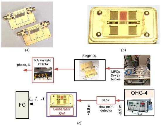 The images of the SAW devices (including the packaging and rr-P3HT films) onto (a) 1280 Y-X LiNbO3 and (b) ST-x quartz substrates; (c) schematic diagram of the setup utilized for testing the single delay line (top picture) and dual delay lines (bottom picture) (FC frequency counter, SW switchable generator, OHG-4 Owlstone humidity generator, SF52 Michell dew point detector, MFC mass flow controllers, NA network analyzer).