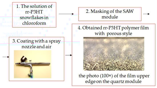The rr-P3HT polymer membrane was deposited in between the two IDTs of the single line and dual-delay line by means of the simple spray coating method. The investigated polymer films were deposited from a previously prepared solution, by spraying with a pistol of a nozzle thickness of ~0.4 mm. Compressed synthetic air at a pressure of about 1 atm was applied as a carrier gas. The solution was prepared by dissolving ~1 mg of the rr-P3HT polymer “snowflakes” in 1 mL of chloroform. The nozzle distance from the substrate with IDTs during the spray process was approx. 40 mm. Experimentally suited to the utilized masking window and the parameters of spray coating, a distance of less than ~40 mm causes (for this scale for a SAW substrate) too strong a blow of the atomized solution on the transducer, which can cause the agent to penetrate under the mask and settle on the IDTs, resulting in its permanent damage. A distance of more than 40 mm leads to unnecessary and lossy covering of a larger area of the mask with a solution of rr-P3HT polymer. The deposition time was approx. 2–4 s. The procedure allowed to form the polymer films with different thicknesses, estimated on the base of AFM measurements []. The most important steps of this simple method are presented in the Figure 2.