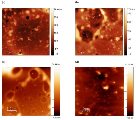 Figure 3 and Figure 4 show AFM images data of the surface topography of the rr-P3HT layers deposited on LiNbO3 and quartz substrates. Figure 3a–d shows the 2D AFM maps collected at a scan-size of 5 μm referred to samples having thicknesses of ~240, ~130, ~80 and 40 nm, respectively, which were used in films in a single delay line configuration. The corresponding Rs surface roughness values are 30 nm, 28 nm, 10 nm, and 5 nm. The AFM topography of a much thicker film (~600 nm) used in a dual-delay line quartz module for the more precise frequency investigations, is reported in Figure 4 showing the 3D rendering of the morphology. The Rs value for this sample is ~94 nm. The AFM data revealed that the surface roughness of the layers increases with increasing the layer thickness. The morphology data of Figure 3 and Figure 4 show that the roughness is mainly due to the characteristic features of the thin spray-coated films. In fact, circular holes or pits are present, which are likely originated by the evaporation of the solvent present in the film as it is being deposited. The lateral size of such structures is in the range between few hundreds of nanometers and about 1 μm, while the depth is of the order of 10 nm. These structures are clearly less present and pronounced for the thinnest film (~40 nm).