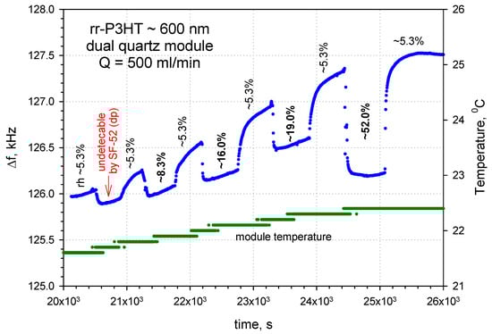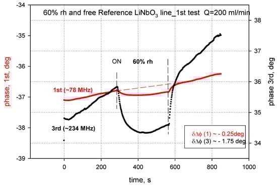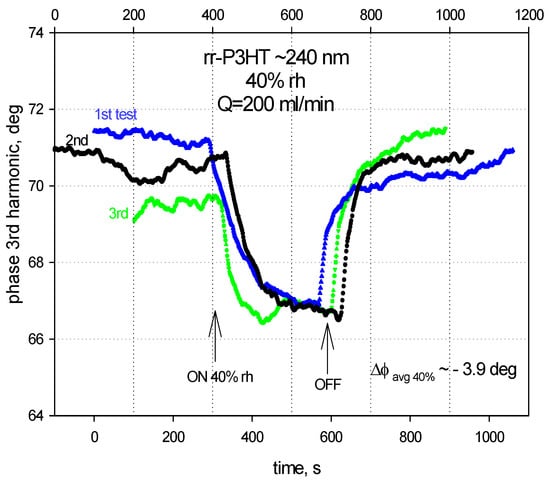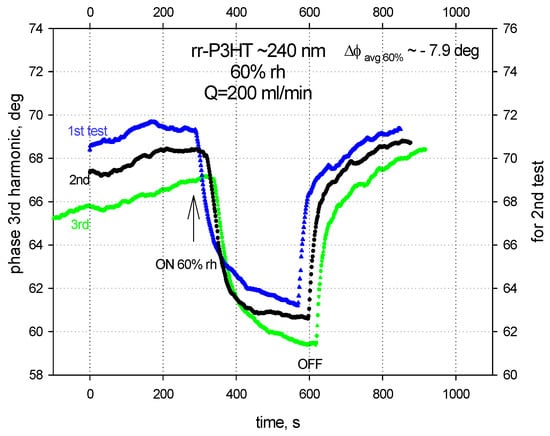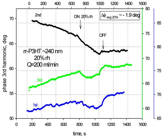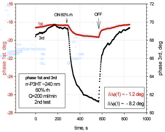 The example of the humidity sensing results for the rr-P3HT polymer film ~240 nm thick at 60% RH in single SAW delay line configurations is showed in Figure 8. Here, the average phase shifts for the three independent measuring tests of the SAW 3rd harmonic was ~−7.9 deg.