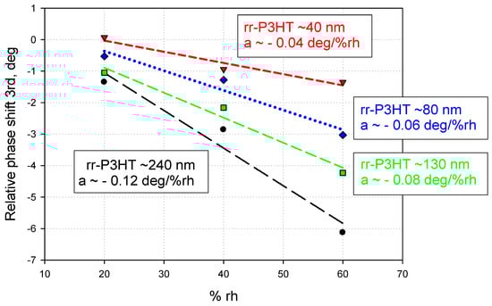 Therefore, the (rh) induced phase shifts of the third harmonic SAW in rr-P3HT polymer films on the LiNbO3 substrate are presented in Table 1; the relative phase shifts (absolute phase shift—phase shift of the reference free line) are shown in Table 2 and in Figure 10.