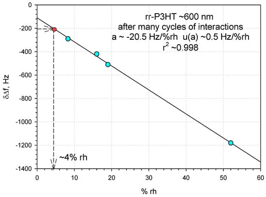 Figure 12 shows the calibration curve (frequency shift vs RH) of the quartz-based dual delay line with rr-P3HT film ~600 nm thick: the sensor sensitivity, estimated by the slope of the curve, resulted to be of −20.5 Hz/% rh. The limit of detection (LOD), i.e., the smallest amount of relative humidity capable of producing a sensor response distinguishable from noise, can be theoretically estimated at ~0.4% which is an admissible value considering that a frequency shift of 20 Hz is easily measurable even in the presence of noise with an amplitude of 8 Hz, as measured in our case.
