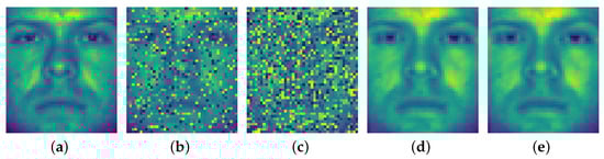 For example, we chose an image from the dataset and manually added random pixel corruption to the image with corruption rates = 0.3 and 0.6, as shown in Figure 1b,c. Then, the image was resized to the vector b, and the whole dataset without the chosen image was A. By using the RASVRG, the recovery vector was then computed as the matrix multiplication of A and . Eventually, the recovery image was resized to a recovered vector. As we can see in Figure 1d,e, our algorithm could recover the damaged image excellently, which shows that the RASVRG enjoys good robustness intuitively.