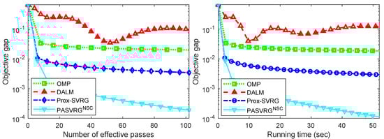 From Figure 2, we can see that the RASVRG consistently achieved accuracy rates over 95% and outperformed other methods, including the Prox-SVRG algorithm. Compared with the Prox-SVRG algorithm, the RASVRG could achieve a higher accuracy in a shorter time, which also shows the obvious acceleration effect of our RASVRG method. We all know that OMP is a fast algorithm, but its accuracy is usually the lowest. Other algorithms such as the Prox-SVRG algorithm run quickly but ultimately do not reach the highest accuracy. It can be seen that the clustering accuracies of all the algorithms except OMP fluctuated up and down over time. In addition, the accuracies of the Prox-SVRG decreased even after 4 s in Figure 2e, while the RASVRG had the most stable performance and always achieved superior accuracy over other algorithms. Moreover, it was found that the performance of the DALM and Prox-SVRG algorithms was affected by the change in , while the RASVRG had stable performance. Moreover, we compared the convergence performance (including the objective value minus the minimum value (i.e., objective gap) versus the number of effective passes or running time) of all the methods, as shown in Figure 3. Note that evaluating N component function gradients or computing a single full gradient was considered one effective pass. All the experimental results show that the proposed RASVRG algorithm converged significantly faster than other methods.