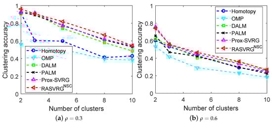 The clustering performance of all the methods is shown in Figure 4. The RASVRG attained the highest clustering accuracy in almost all cases. It is quite clear that the performance of OMP was the worst in all cases when the random pixel corruption value varied from 0.3 to 0.6. In the case of slight pixel corruption (e.g., ), all the algorithms reached more than 90% accuracy when , except for OMP. The accuracy of Homotopy decreased rapidly when . The Prox-SVRG and PALM had rather close accuracies and maintained high clustering accuracies as k increased. When the random pixel corruption (e.g., ) was high, only the RASVRG and Prox-SVRG algorithms achieved more than 70% accuracy when . As the number of clusters increased, the clustering accuracies of all of the algorithms decreased. DALM performed the best when . Similarly, the RASVRG performed well under various numbers of clusters, and the clustering accuracy was always about 10% higher than that of Homotopy.
