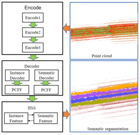The network structure of the perception model designed in this article for three-dimensional point clouds is shown in Figure 2. It includes a shared feature encoder, two parallel branch decoders, and the decoder includes a feature fusion module and a joint segmentation module. There are two parallel branch decoders: one is for extracting semantic features from raw point clouds in orchards, the other is used for semantic segmentation tasks. Finally, the JISS module obtains and processes semantic features and instance features, and outputs two feature matrices. One of the shaped matrices is used to predict semantic categories. Another shape is an instance feature matrix that is used to predict the instance label for each point. In the embedding space, the clustering algorithm (DBSCAN) [20] is used to divide the identified points according to their different densities to form clusters with a reachable density, thereby identifying the natural clustering structure in the data. To put it simply, the points belonging to the same instance object are very close, while the points of different instances are far away from each other, thereby better dividing the environmental semantic information. The point cloud clustering algorithm is shown in Algorithm 1.
