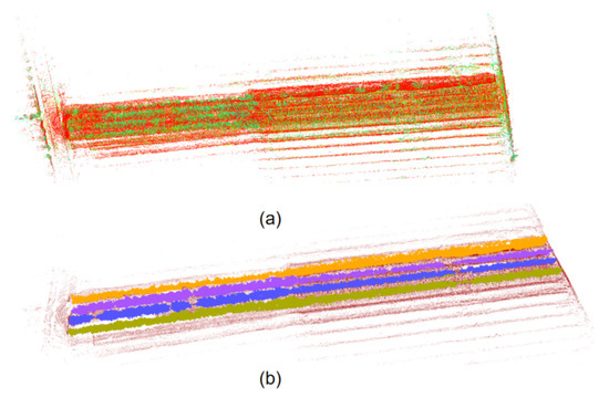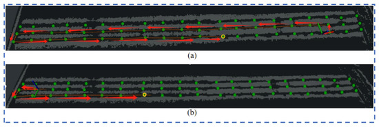 Orchard environmental surveying and mapping is performed based on LIO-SAM, which proposes a framework for tightly coupled LiDAR inertial navigation odometry utilizing GT-SAM. It can realize high-precision, real-time trajectory estimation and mapping of mobile robots. In the experiments of this article, RS Helios 32-line LiDAR and external IMU (frequency 400 hz) are used as the data source for LIO-SAM mapping. According to the previous flight performance in orchards using GPS as the data source for drone positioning, the presence of many obstacles in orchards will seriously affect the GPS signal and affect the flight stability of drones. So, we use IMU measurements instead of GPS when performing LIO-SAM mapping to infer the robot’s movement. The estimation based on IMU pre-integration corrects the point cloud information detected in the environment, and provides a preliminary estimable solution for LiDAR odometry optimization. On this basis, LiDAR will estimate the positioning deviation generated by the IMU through range measurement. With this complete solution, LIO-SAM can effectively simulate and describe the orchard’s geometric features. As shown in Figure 3, we use camera data to color the orchard to clarify the characteristics of the fruit trees. Figure 3a is the distribution of the orchard. Figure 3b is the orchard semantic map extracted using the method of this article. Through the fruit tree semantics’ map distribution, we can see that the global map of the orchard is very unstructured, and at the same time, the distribution of the extracted path points in the map is very uneven. We effectively simulate and describe the orchard geometric characteristics.