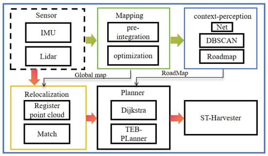 The mobile robot system architecture constructed in this study is shown in the Figure 5 respectively. The core of the system is an industrial computer, which runs a Robot Operating System (ROS). Through the driver provided by the ROS, the system can obtain sensor data. First, the LIO-SAM mapping module was used to conduct global three-dimensional point cloud mapping of the orchard. After the mapping was completed, the feature encoder designed in this study extracted the feature information of the point cloud map in the perception module and generated an information feature map, and passed this instance information to the semantic topology mapping module. This module further refined the ground and obstacle information in the orchard map based on semantic information, and extracted structured information and accessible nodes through a straight line detection algorithm (Hough line transformation) based on the spatial distribution of fruit trees. Finally, the semantic topology mapping module combines semantic data and node information to create a semantic topology map containing directed edges. The global planner in the navigation module performed global path planning based on this map, and determined a series of global path points. Subsequently, the local planner performed local path planning based on these path points to ensure that the path satisfied obstacle avoidance, motion feasibility, and optimal path constraints.