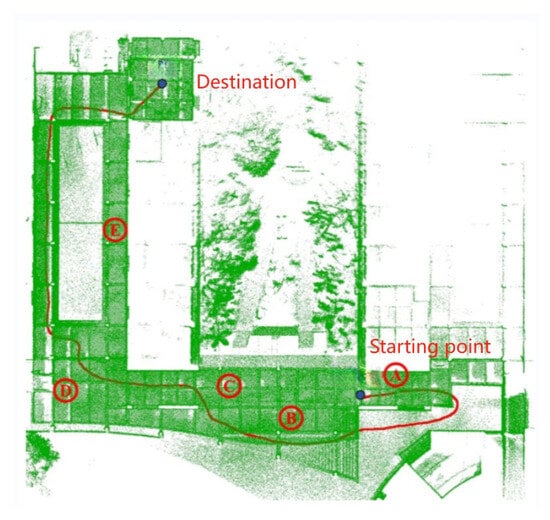 In order to verify the accuracy of the NDT algorithm, this section of the experiment selected multiple locations in the school as starting points, as shown in Figure 6 from A to E. The experiment was repeated ten times. The results of the relocation experiment based on the NDT algorithm are shown in Table 1.