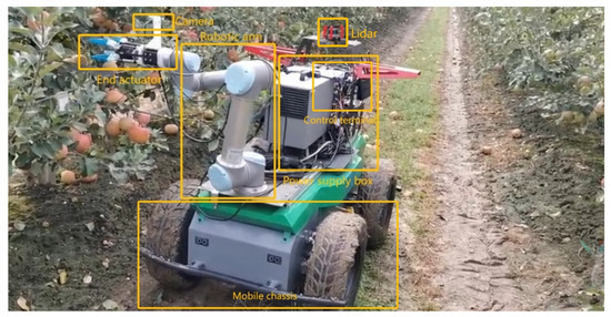 The structure of the movable robot is shown in Figure 7. The robot is equipped with a 32-line LiDAR and an external nine-axis IMU. The LiDAR acquisition frequency is 20 Hz, and the data acquisition frequency of the external IMU is 400 Hz. Data collected through these sensors can be used to create an initial point cloud map of the orchard using mapping algorithms. In this specific experiment, the LIO-SAM algorithm run by the robot uses RS-Helios and external IMU data to construct an orchard point cloud image in XYZI format. The realsense-D435 depth camera is used to acquire color images and combine these images without affecting the structure of the generated map. For visualization of color maps, in Ubuntu 20.04, the sensor suite on the robot is connected to the central computer (NVIDIA Xavier) via the Robot Operating System (ROS Noetic). Data from the RS-Helios is transferred to a central computer via an Ethernet port, and using the rsLiDAR-ros driver, the ROS system passes the sensor data from the sensor suite to the mapping module. The mapping module generates a global point cloud map. The perception module proposed in this article perceives object-level fruit tree information from the map and generates semantically rich maps through semantic mapping. Finally, through the ROS system, the constructed semantic map information and navigation information are visualized, and interact with the operator.