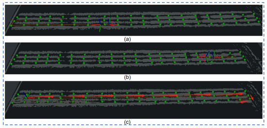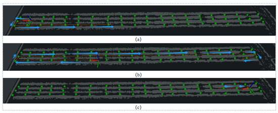 Experiment 1: The direction of travel of the robot to the target point set in the experiment is the same as the direction of the shortest path planned by the robot. The visualization results of the proposed planning algorithm are as shown in Figure 8a–c. As shown, all can reach the target point according to the planned shortest path. The planned path of the native TEB-planner planner is as shown in Figure 8c. The planned path will pass through the crop rows to reach the target point. It does not reach the target point in the specified direction, so it fails. Based on the method proposed in this article, the navigation framework and the TEB-planner planning path using the optimized map can successfully reach the target point according to the set direction.