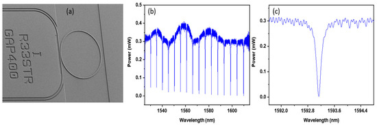 (a) A SEM image of the fabricated MRR with looped access waveguides, (b) The transmission spectra of the MRR, (c) The selected resonance of the MRR with a quality factor Q of 20,000.