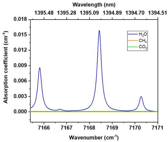A fibre pigtailed laser diode (Eblana Photonics, EP1395-0_DM_B01_FADES4082, Dublin, Ireland) of wavelength λ = 1395 nm was used as the excitation source. The laser targets the water (H2O) absorption line of the fundamental band falling at 7168.43 cm−1 (Figure 3). The absorption cross section of the transition was retrieved from the HITRAN database [30] and has a maximum value of 1.5 × 10−22 cm2/molecule. The simulated absorption spectrum given in Figure 3 shows the absorption spectra of the main IR active gases present in the atmosphere (water, carbon dioxide and methane) according to their natural abundances and assuming a line broadening typical for air at normal pressure. From this data, it is evident that the chosen transition of the water molecule at 7168.433 cm−1 is not obscured by other IR active molecules in air. Therefore, by utilizing the narrow emission of the selected laser diode it is possible to probe the water vapour in air in a highly selective manner.
