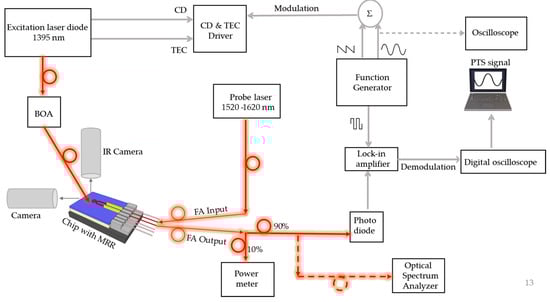 A booster optical amplifier (BOA, Thorlabs BOA1410P) was driven by a separate TEC and LD controller (Thorlabs CLD1015) and used to vary the output power of the excitation laser. A sinusoidal signal of frequency 6 kHz was applied as the external amplitude modulation to the excitation laser through the LDC. The digital version of the same signal was then given as the trigger to the Lock-In Amplifier (LIA, Stanford research systems, SR830 DS). A slow voltage ramp (sawtooth signal) of periods between 60 and 180 s was then applied to scan the laser current in time. Both signals were generated from a two-channel Function Generator (FG, Lamda, Rigol DG812, Harpenden, UK) and observed in an oscilloscope (Rigol DS1102E). Simultaneously, the output from a broadband (1520–1630 nm) tuneable laser source (TLS, Yenista Optics Tunics- T1005-HP, Princeton, NJ, USA) was launched as a probe signal via a fibre array to and from the MRR. Its output was collected by a InGaAs-based amplified photodetector (PD, Thorlabs PD10CS2) via a 90:10 fibre optic splitter where 90% of the power was connected as the signal input to the LIA and the other 10% was connected to the power meter to observe the resonance of the MRR. The signal, which was sent to the LIA, was demodulated at the 1st and 2nd harmonic. The integration time varied between 300 ms and 1 s. The output from the LIA was converted using a Digital Oscilloscope (Pico technology, Picoscope R4262, St Neots, UK) and then recorded by Picoscope 6 software in a laboratory computer.