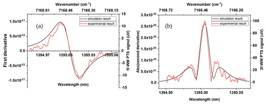 Spectra of 1f-WM PTS (a) and 2f-WM PTS (b) signals recorded as a function of the excitation laser wavelength. Black lines are the theoretically predicted 1f and 2f spectra.