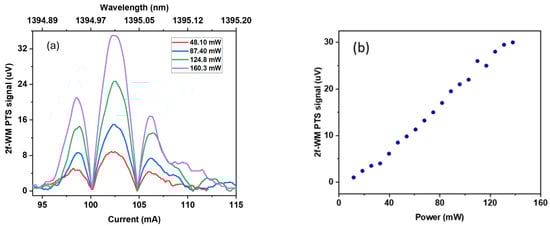 (a) 2f-WM PTS signal at different powers of the amplified excitation source. (b) Maximum 2f-WM PTS signal as a function of excitation power.