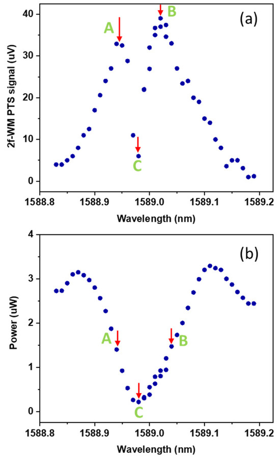 (a) 2f-WM PTS signal as a function of the probe wavelength where points marked as A and B correspond to the inflection points of the resonance dip and the point C is at the resonance wavelength. (b) The resonance dip of the MRR along which the 2f-WM PTS signal from part (a) was scanned.