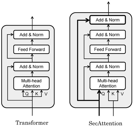 Figure 6 shows the difference between the Transformer and our extended SecAttention. In the Transformer, the input to the block is normalized twice before output but, in our extended SecAttention, the input to the block is re-concatenated before normalization so that the input features leave the block in their original form. The input and output matrixes of the SecAttention module have the same dimensions but, by directly modeling the relationship between any two positions in the sequence, we can better capture the long-range dependencies in the sequence. The effect of this seemingly trivial improvement on the data is demonstrated numerically in the ablation study in the experimental section. Additionally, Transformer models typically employ the same input for linear transformations to derive queries, keys, and values. In contrast, our SecAttention model utilizes data transformed from features for its keys and values. For queries, we retained the original information and applied a linear transformation to it.