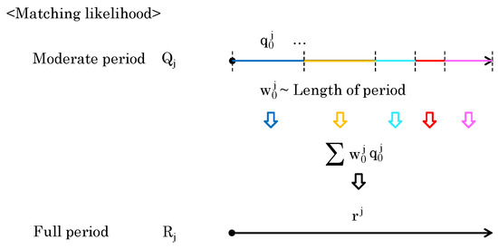 To compute the full-period likelihood , consider integrating a set of moderate-period likelihoods . Each element of is obtained from different period lengths. When the likelihood of an element of longer period is high, the likelihood of the full period can also be considered high. Conversely, even if the moderate-period likelihood of the element is high, the likelihood may not indicate a trend for the entire dataset. Therefore, the period length should be reflected in the calculation of the full-period likelihood. As shown in Figure 9, the period length of moderate-period likelihood is directly used as a weight to obtain .