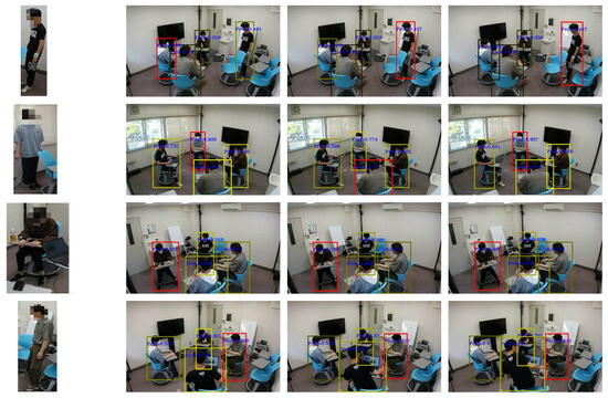 In Figure 14, we show a visualization of part of the experiment. The red box indicates the matching target of the data, and the color depth of the other boxes indicates the probability of the matching result. The darker the color, the lower the matching value, and vice versa. In each of the examples shown in the figure, the person wearing the wearable sensor was correctly estimated with Update Rules 1 and 2. Using one method alone produced one false result. The use of both update rules together comprehensively provided more accurate results. For the other people, different likelihoods were obtained depending on the movement of the trajectory. The correct person was extracted regardless of the position in the image or the depth position.