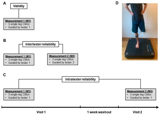 Experimental setup illustrating the validity, intertester, and intratester reliability assessments. (A) Validity determined using simultaneously recorded single-leg counter movement jumps at Measurement 1 comparing the Orthelligent Pro sensor with force plate (ground reaction force). (B) Intertester reliability comparing Measurement 1 with Measurement 2. (C) Intratester reliability assessed by comparing Measurement 1 with Measurement 3. (D) Study setup depicting the participant in the starting position for the single-leg CMJ on the force plate while wearing the Orthelligent Pro sensor around the lower leg.