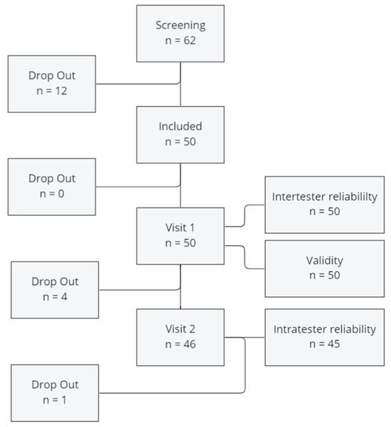 Fifty patients aged 20–55 years participated in this study. Their anthropometric data are shown in Table 1. Four participants could not attend the second visit. Therefore, 46 participants were included for measuring intratester reliability. At Visit 2 (Measurement 3), one patient dropped out due to very low and obviously unrealistic measured values. To determine validity and intertester reliability, 100 single-leg CMJs of 50 participants were compared. To assess intratester reliability, 90 jumps of 45 participants were analyzed (Figure 2).