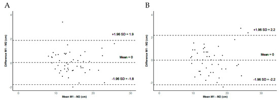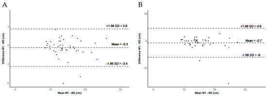 Intertester reliability. (A) Bland–Altman plot illustrating the mean difference (mean) and the 95% confidence interval of jump height between Measurement 1 (M1) and Measurement 2 (M2), based on the means of three jumps; (B) Bland–Altman plot illustrating the mean difference (mean) and the 95% confidence interval of jump height between Measurement 1 (M1) and Measurement 2 (M2), based on the maximum of three jumps.