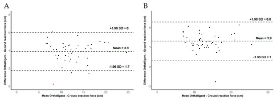 The Orthelligent Pro sensor versus force plate (calculated via ground reaction force). (A) Bland–Altman plot illustrating the mean difference (mean) and 95% confidence interval of jump height measured by means of the Orthelligent Pro sensor or force plate (calculated via ground reaction force), based on the mean of three jumps; (B) Bland–Altman plot illustrating the mean difference (mean) and 95% confidence interval of jump height measured by means of the Orthelligent Pro sensor or force plate (calculated via ground reaction force), based on the maximum of three jumps.