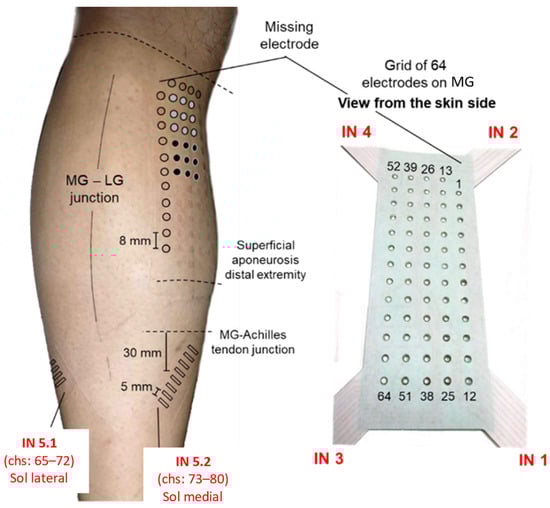 EMG electrodes’ positioning. The relative position of the different systems of electrodes used to sample surface EMGs. The red text, comprising acronyms from IN 1 to IN 6, provides a reference for opening and reading the data stored via the acquisition software. Schematic illustration of the relative positions of surface electrodes on the skin regions covering the medial gastrocnemius (MG) and soleus (SO) muscles. The specific position of surface electrodes is represented by their prints on the skin: circles (MG) and rectangles (SO) were drawn on the picture to emphasize the prints left on the skin upon the electrodes’ removal. The two monopolar electrodes (two groups of 3 × 3 electrodes), considered to simulate the bipolar system and used to record EMGs from the MG muscle, are indicated with gray and black circles.
