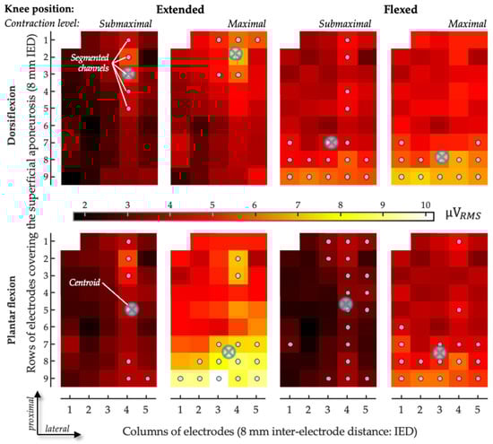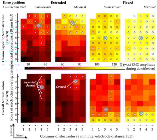 An alternative, opposite issue to the spatially limited view provided via surface electrodes is crosstalk [41]. In some cases, the fibers of the target muscle, as well as those of other, perhaps antagonist muscles [42], may be included within the pickup volume of the surface electrodes. Even though we acknowledge the possibility of crosstalk, we see two reasons why this is unlikely to explain the results reported here. First, since crosstalk originates from a distant muscle, due to the conduction volume effect [43,44,45], any crosstalk would be expected to manifest with equal amplitudes across the various electrodes in the grid: it would not explain the regional differences in excitation observed here or, thus, the differences between bipolar and HD-EMGs. Second, the inter-electrode distances considered here are sufficiently small to minimize crosstalk: for a 10-mm inter-electrode distance, we observed crosstalk from the SO to the GM of less than 5% [11]. With our high-density system of electrodes, we believe we have contended with crosstalk while highlighting differences in the topographical activity distribution in the GMs of healthy subjects [28]. In hemiparetic subjects, for the two knee positions and for the two effort levels, antagonist activation with channel-specific normalization provided centroid values confined, on average, from 35% to 45% of the muscle’s longitudinal axis. This range increased to 35–75% when the overall normalization procedure was considered. For the knee-extended position in particular, centroids obtained with the overall normalization were located 20% more distally than those obtained with the channel-specific normalization procedure. These local differences in centroid values, together with the relatively small number of segmented channels and the differences in CAN values between detection modes, indeed suggest that gastrocnemius agonist and antagonist activities are located differently in subjects with hemiparesis as well.