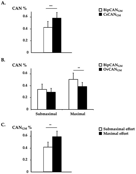 Coefficient of ANtagonist activation in the gastrocnemius medialis. The coefficients of agonist activation with bipolar EMG (BipCAN) and HD-EMG using channel-specific normalization (CsCAN) and overall normalization (OvCAN) from the gastrocnemius medialis (GM) in 12 patients (means ± standard errors of the means) assessed in a seated position. (A) Results of mean BipCANGM and CsCANGM with data from both effort levels and from both knee position conditions pooled. (B) Results of mean BipCANGM and OvCANGM by effort level with data from both knee position conditions pooled. (C) Results of mean CANGM in submaximal and maximal effort conditions with data from both EMG systems and from both knee position conditions pooled. **, p < 0.01; ***, p < 0.001.
