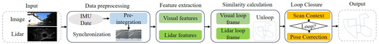 TS-LCD processing pipeline showing the LiDAR, camera, and IMU data input, preprocessing, and feature extraction. The loop-closure detection module utilizes both visual and LiDAR information for two-stage detection.