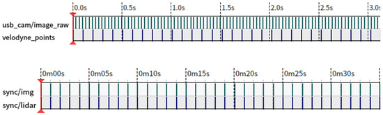 For each frame of the point cloud data, its timestamp is registered, and for each frame of the image, its timestamp is registered. The timestamps of the LiDAR and camera are sorted separately. For each LiDAR timestamp , find the closest neighboring timestamps and in the camera timestamp sequence. If the neighboring camera timestamps and are located on either side of , the camera timestamp corresponding to can be estimated using linear interpolation or other interpolation methods. The linear interpolation formula is:
