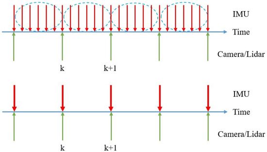 The IMU acquires the acceleration and angular velocity, and the position information of the keyframes can be obtained through the integration operation of the IMU measurements. The sampling frequency of the IMU is much larger than the keyframe release frequency of the image and the laser, corresponding to the red line and the green line in Figure 4, respectively. Assuming that the two neighboring red lines correspond to moments k and , the average acceleration and the average angular velocity of the IMU during this time period are, respectively,