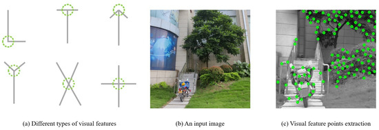 For the selection of visual features, this paper calculates the autocorrelation matrix of each pixel point in the image and then determines whether the point is a corner point based on the eigenvalues of this matrix. Corner points are areas where the image signal changes significantly in two-dimensional space, which typically include significant change areas such as corner points, intersections, and textures. The visual feature extraction method is shown in Figure 6. The expression of the autocorrelation matrix is