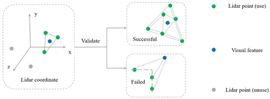 For each visual feature, the three closest LiDAR points can be selected via a KD-tree. Depending on the depth of these points, a validation process is performed to improve the accuracy of subsequent matching. The specific validation process involves calculating the Euclidean spatial distances of the three nearest LiDAR points to the current visual feature. In the experiment, if the farthest distance between the three points is less than 0.5 m, the validation is successful, and the depth can be calculated by bilinear interpolation. Otherwise, triangulation is applied to assign depths to visual features. Figure 7 shows the exact process of validation. The purpose of the validation process is to check whether the points are in the same plane; if the depth difference is too large, the points may be in different planes and therefore need to be excluded, thus reducing the possibility of false matches.