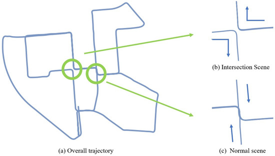 The unmanned vehicle experiment used an unmanned vehicle equipped with a 16-line LiDAR (RS-Helios 16), a six-axis IMU (HFI-B6), and a binocular camera (Astra Pro). The experiment was conducted in a campus setting, with the experimental equipment shown in Figure 10a. We selected a circular route around the parking lot in the campus environment for experimental analysis. Figure 10b shows the projection of the traveling trajectory of the unmanned vehicle on the satellite map.