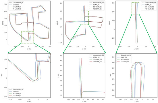 To further analyze the advantages of the proposed framework, a qualitative analysis was conducted using sequences 00, 05, and 07. The results are shown in Figure 9. In these scenarios, TS-LOAM demonstrated superior performance compared to both LOAM and SC-LOAM. When compared to the ground-truth trajectory, the improved accuracy of TS-LOAM was evident on end-to-end drift constraints, primarily due to the second-order loop-closure detection strategy. The green rectangular boxes mark the areas where TS-LOAM showed significant improvements. Both LOAM and SC-LOAM exhibited noticeable drift, while TS-LOAM consistently maintained alignment with the ground-truth trajectory, proving the high robustness of the proposed algorithm.