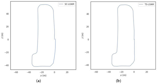 Odometry is an essential component of SLAM, and its accuracy is primarily reflected in the precision of trajectories without loops. Here, we compare the odometry performance of TS-LOAM with LOAM and SC-LOAM. The quantitative comparison results are shown in Table 1 and Table 2, where TS-LOAM refers to the addition of our loop-closure algorithm to LOAM. Compared to the baseline algorithms, TS-LOAM achieved the best performance, with an ATE of 1.87 and an ARE of 1.13 . The ATE was reduced by an average of 2.66 and the ARE by an average of 1.44 .