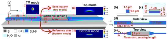The integrated bimodal sensor under investigation consists of two photonic WGs based on the SU-8 material forming the input and output of the device, and an Al plasmonic stripe WG that is placed between them and on top of a suitably thinner SU-8 WG, called the bottom SU-8 layer. Figure 1a depicts the 3D conceptual schematic of the studied plasmo-photonic bimodal sensor, while Figure 1d,e show the side and top views of the structure, respectively. The plasmonic WG supports two different surface plasmon polariton (SPP) modes: (i) the top mode at the interface between the Al stripe and the surrounding medium which plays the role of the sensing branch, and (ii) the bottom mode at the interface between the Al stripe and the bottom SU-8 layer which plays the role of the reference branch. These modes are excited by a fundamental TM photonic mode launched into the input SU-8 WG and, after propagating along the metal surfaces, interfere at the output photonic part, realizing in this way the single-arm interferometer.
