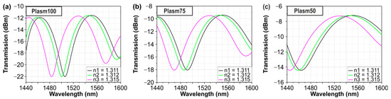 where FWHM is the full-width at half-maximum. Applying the above equation in the presented sensors, the FoM is equal to 175, 81, and 57 RIU−1 for 100, 75, and 50 μm plasmonic stripe lengths, respectively. For larger plasmonic stripe lengths, the FSR value is decreased, and the dip is narrower than in the case with smaller plasmonic stripe lengths and larger FSRs. So, the FWHM is smaller in sensors with longer plasmonic waveguides and, consequently, the FoM increases.