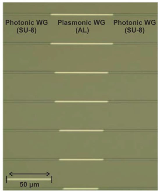 The proposed sensor was fabricated on a 150 mm Si substrate containing a 3 μm thick thermally grown SiO2 layer. The first SU-8 layer was spin-coated on the entire wafer and a two-stage soft-bake process on hot-plates was followed. The SU-8 structures were exposed with optical i-line stepper lithography. After development, the wafer underwent a hard-bake process to cross-link the resist, resulting in the formation of the bottom SU-8 layer (referred to as the bottom SU-8 layer) with a measured thickness of 0.9 μm. The hard-bake process ensured the mechanical and chemical stability of the fabricated SU-8 WGs. After completing the fabrication of the bottom SU-8 layer, the Al layer was deposited using an electron beam evaporator, resulting in a plasmonic stripe WG. More specifically, a layer with 80 nm thickness was deposited onto the bottom SU-8 layer. Another i-line lithography process was used for the patterning of the metal layer. The process flow of the second (top) SU-8 layer was very similar to that described above. The height of the second SU-8 layer was equal to 0.9 μm. However, the deposition and exposure parameters were optimized considering the topography generated after the fabrication of the bottom SU-8 layer. Figure 3 depicts a microscope top-view image of the fabricated sensors showing varying Al lengths. To form the coupling edge required for butt-coupling, the wafer was diced down into 2 cm × 2 cm chips by gently sawing through the SU-8 WGs.
