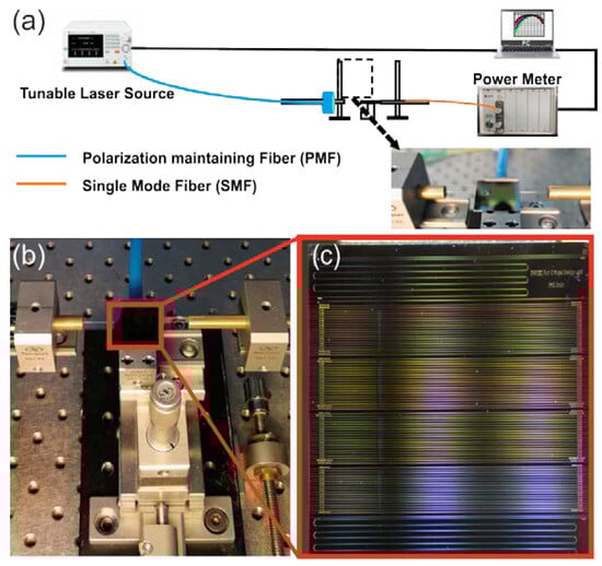(a) Schematic of the experimental setup, (b) photo from the probe station used for optical characterization and refractive index experiments, (c) zoomed-in photo of the fabricated IC.