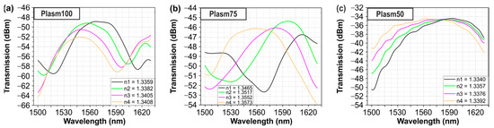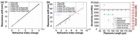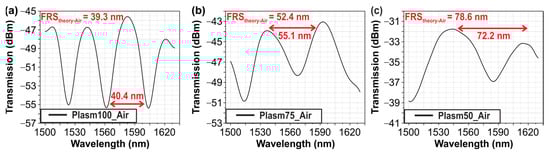 The first characterization step to perform sensitivity measurements for the different plasmonic sensors was the optical characterization of the sensors in air. Figure 5a–c show the experimental spectra obtained for three different plasmonic lengths (i.e., 100, 75, and 50 μm). In each spectrum of the above plasmonic structures, a Fast Fourier Filter was applied, as mentioned also in [19], to better identify the interferometric response and track the performance of the structures. It is evident that the experimentally observed FSR values are in good agreement with the values expected from theory, confirming the bimodal operation.