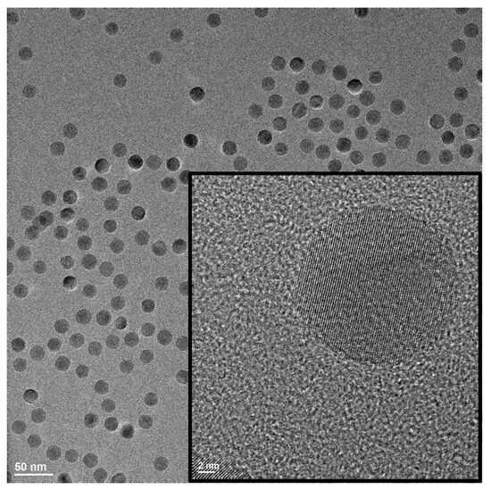 Magnetite nanoparticles were made using the process presented in Vreeland et al.’s article [21]. The work described in this article used magnetite nanoparticles synthesized with an average diameter of ≈20 nm. The size distributions were determined by using small-angle X-ray scattering (SAXS). Before taking the SAXS measurements, each sample was filtered through a 0.22 μm filter. From the best-fit curves for the SAXS data, the average diameter was 20.2 nm and the dispersion was 4%. The SAXS curve can be seen in S1. A Technai transmission electron microscope (TEM) image taken of the magnetite nanocrystal can be seen in Figure 2.