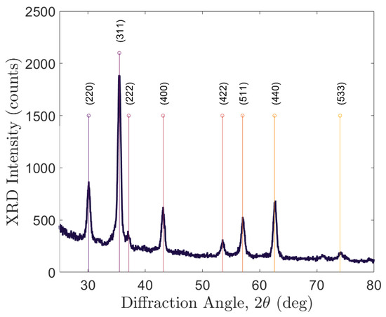 XRD measurements of the magnetite nanocrystal samples showing peaks at 30.1°, 35.5°, 37.1°, 43.1°, 53.5°, 57.0°, 62.6°, and 74.1°. These peaks correspond to material.