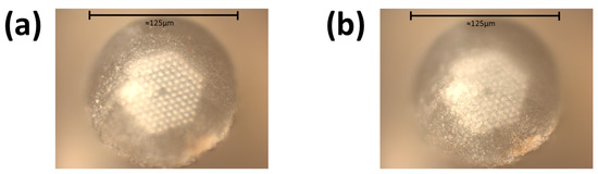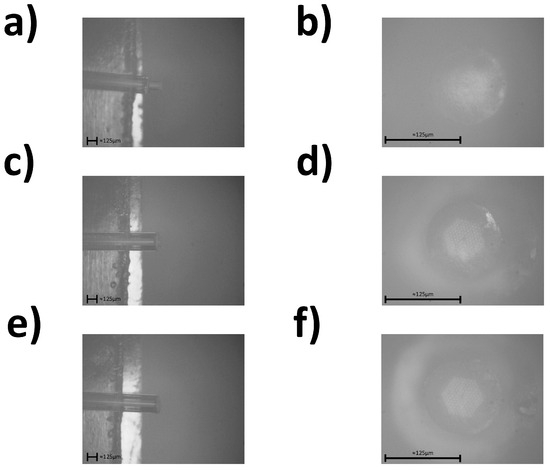 There is an optimal setting to cleaving the PCF using a femtosecond pulsed laser as too aggressive of a cut can lead to major deformations of the surface. The tip of the PCF needs to be as intact as possible to ensure proper waveguiding and the structural integrity of the microchannels. First, a long length of fiber was loaded into a FemtoScribe system. The laser was set to cut the fiber over 10–20 passes. The laser was set at an output wavelength of 1035 nm and a pulse duration of 350 fs. The additional laser parameter settings used to home in on the optimal cutting can be seen in Table 1.