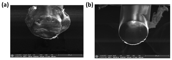 SEM images taken after the femtosecond laser cutting and the PFIB plasma-cleaning processes. (a) Shows the PCF after being cut by a femtosecond pulsed laser and (b) shows the same PCF having the redeposited glass being cleaned up by a PFIB.
