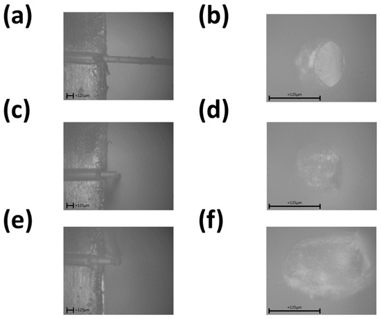 (a) Side view microscope image of test one. (b) Top view microscope image of test one. (c) Side view microscope image of test two. (d) Top view microscope image of test two. (e) Side view microscope image of test three. (f) Top view microscope image of test three.